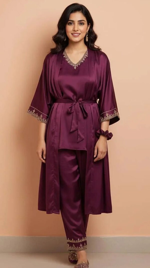 This 3-piece set includes a robe, camisole top, and matching trousers β offering both comfort and elegance for relaxing evenings or lounge wear.
